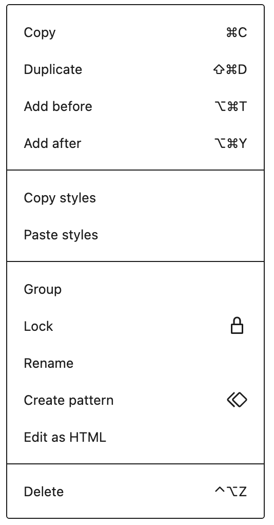 If you click on the three dots highlighted above, you will get the following options for all blocks, regardless of the type: