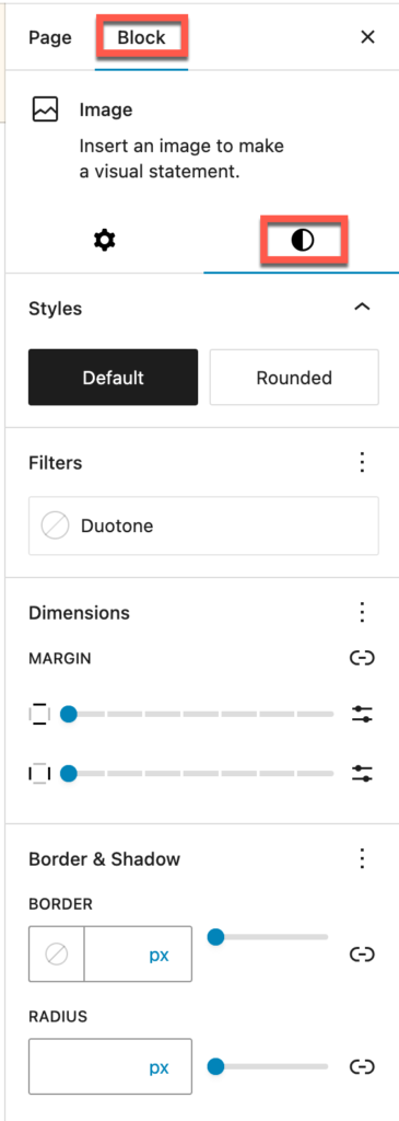 As its name suggests, the Styles Settings control the look and feel of the block. For the example below, the image maybe be rounded, filtered, and resized; a shadow can be added to it so that it stands out, and a border could surround it.