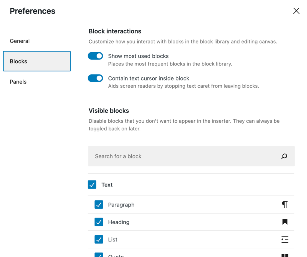 If you click three dots on the upper right hand corner of your screen and scroll down to “Preferences” and toggle on “Most Used,” another convenient category will appear at the top of the list. On this page you may also control which blocks are visible – you can toggle on/off their visibility.